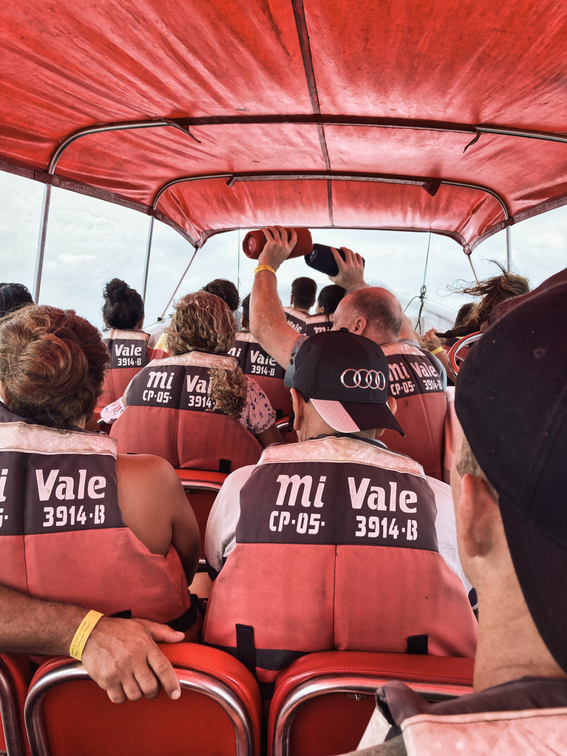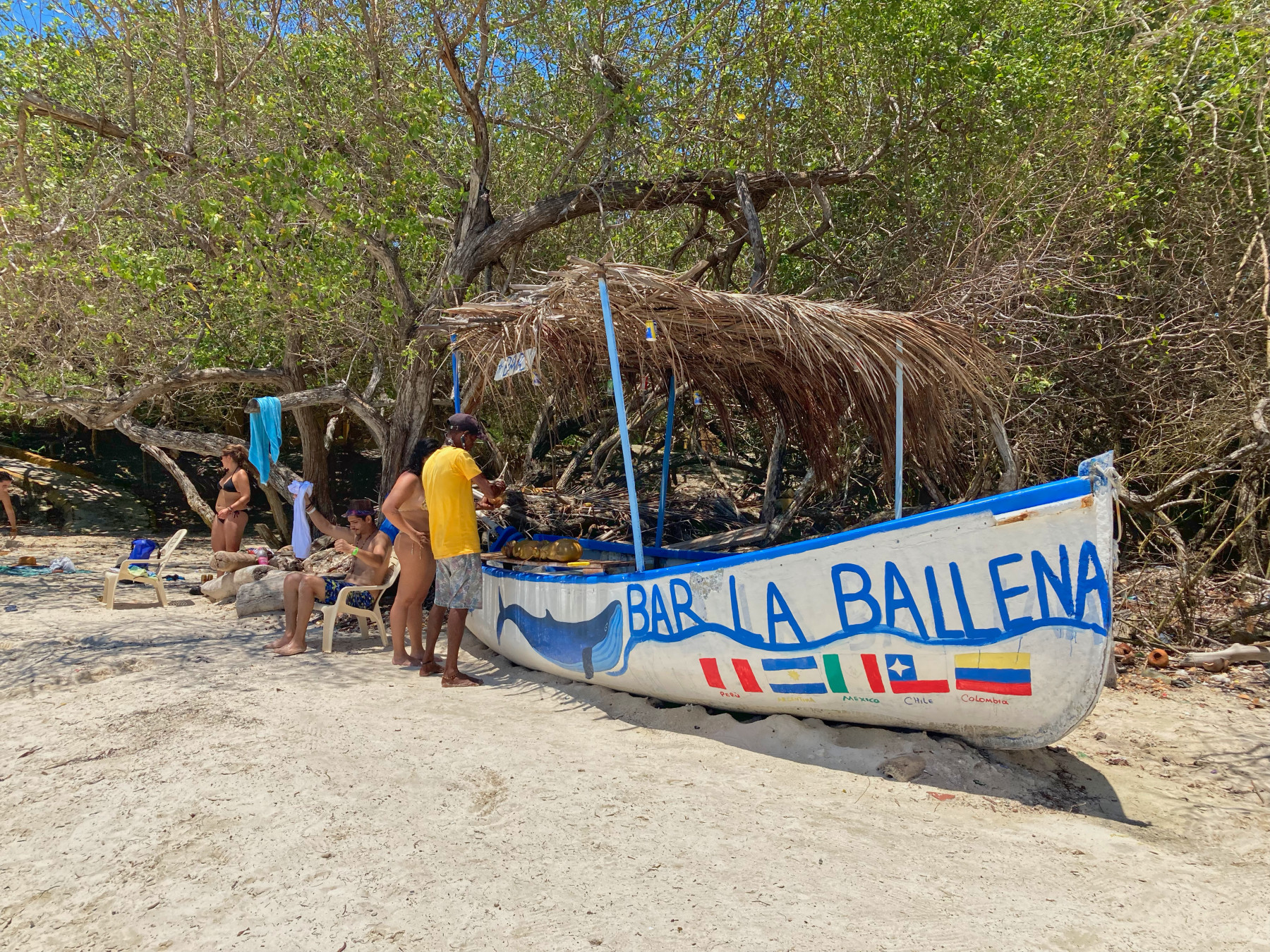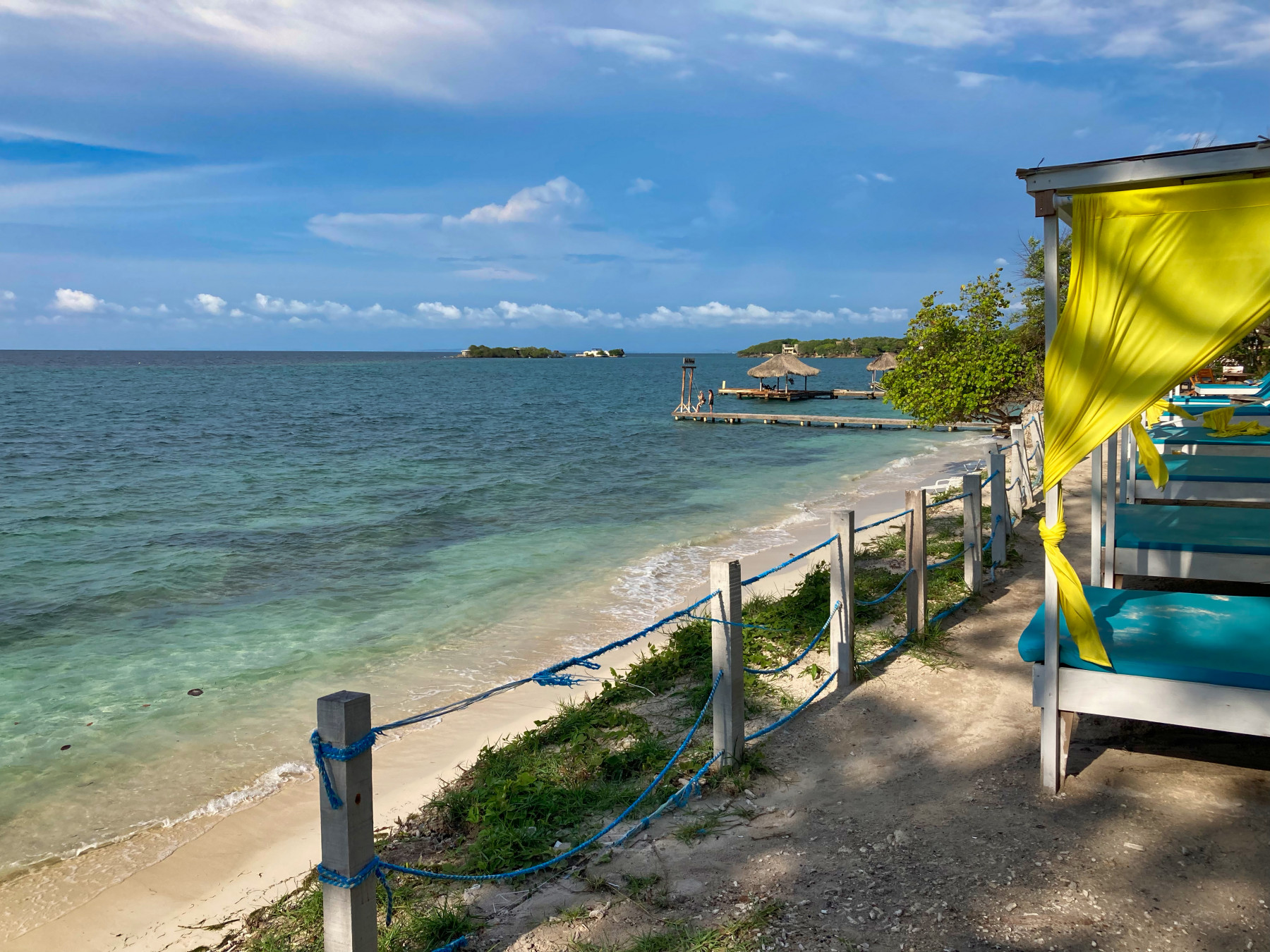 Nachdem Doro ihren Kitesurfing-Kurs erfolgreich absolviert hatte, wollte Antje gern mal wieder ein bisschen Schnorcheln gehen. Zwar waren wir sowohl in Cartagena, als auch in Playa la Boquilla an der Karibikküste – kristallklares Wasser gab es dort jedoch nicht und es war meist auch zu wellig, um zu schnorcheln. Also entschieden wir uns zur Isla Grande der Rosario Islands zu fahren – nicht allzu weit vom Festland entfernt. Wir checkten also erneut für eine Nacht in Cartagena ein (Hotel unten aufführen), um am nächsten Morgen pünktlich am Hafen zu sein, um das erste Boot zu erwischen. Das Fährticket, sowie den Transport dorthin hatten wir bereits online gebucht. Also sind wir den nächsten Morgen früh aufgestanden, haben uns das Frühstück geschnappt, welches uns das Hotel netterweise verpackt hatte mit einem Teil unseres Gepäcks und etwas Verpflegung (Wasser und Snacks) standen wir nun auf einer Straße in der Cartagena Altstadt – und standen. Wir wussten, wir mussten rechtzeitig am Hafen sein. Zum Glück hatten wir die Nummer des Shuttleunternehmens und stellten schonmal klar, dass wir bereit vor Ort standen. Es kam die Info, dass sich das Shuttle verspätet. Also standen wir weiter. Dann die Info, dass wir ein Taxi nehmen sollen und es dann bezahlt würde. Alle Taxis, die vorbeifuhren, waren jedoch voll. Dann die Info, dass der „Chico“ kommen würde. Wir warteten also. Nach weiteren 10min kam tatsächlich ein Chico an, begrüßte uns…und versuchte ein Taxi anzuhalten (also das hätten wir in den 10min bestimmt selbst auch noch hinbekommen). Nunja, es gelang, wir fuhren zum Hafen, wurden von recht genervten Hafenmitarbeiterinnen in eine Liste eingetragen und dann standen wir dort und wussten nicht, welches der vielen Boote unseres war. Unter einem Zelt saßen schon viele andere Wartende – die wahrscheinlich auch nichts davon hatten, dass sie pünktlich waren. Irgendwann bekam Doro dann raus, dass unser Boot noch nicht da war und wir quetschten uns zu den anderen Reisenden in den Wartebereich. Neben uns fächelte ein älterer Typ seiner viel jüngeren Begleiterin dauerhaft Luft zu. Dass er noch weitere Serviceangebote dabei hatte, bekamen wir später mit. Irgendwann wurde unser Boot aufgerufen und wir stürmten hin, um einen der hinteren Plätze zu bekommen – aus Erfahrung mit anderen Schnellboten wussten wir, vorne kann es ganz schön hart für den Popo werden, wenn das Boot über die Wellen hüpft. Das Boot war voll und los ging die Fahrt. Schön, Cartagena mal von der Wasserseite aus zu sehen. Dann ging’s eine Stunde über’s offene Meer und wurde natürlich wieder recht holperig. Wir waren also froh über unsere hinteren Sitzplätze. Ein paar Reihen vor uns saß der ältere Typ, der vorhin noch den Fächerer gegeben hat und holte auf einmal zwei tragbare Lautsprecher aus seinem Rucksack. Die übliche Reggeaton – Musik ging an und er hielt die Boxen direkt neben die Ohren seiner Begleitung. Wir waren erneut froh, dass wir weiter hinten saßen und aufgrund des Motorkrachs nicht viel von der Musik hörten. Die umworbene Frau schien es nicht weiter zu stören, dennoch schien sie ihren bemühten Begleiter nicht mehr zu mögen, als wir. Egal, er hielt weiter seine Boxen mal mit gekrümmten, mal ausgestreckten Ellenbogen und war damit unsere Kuriosität des Tages ;).