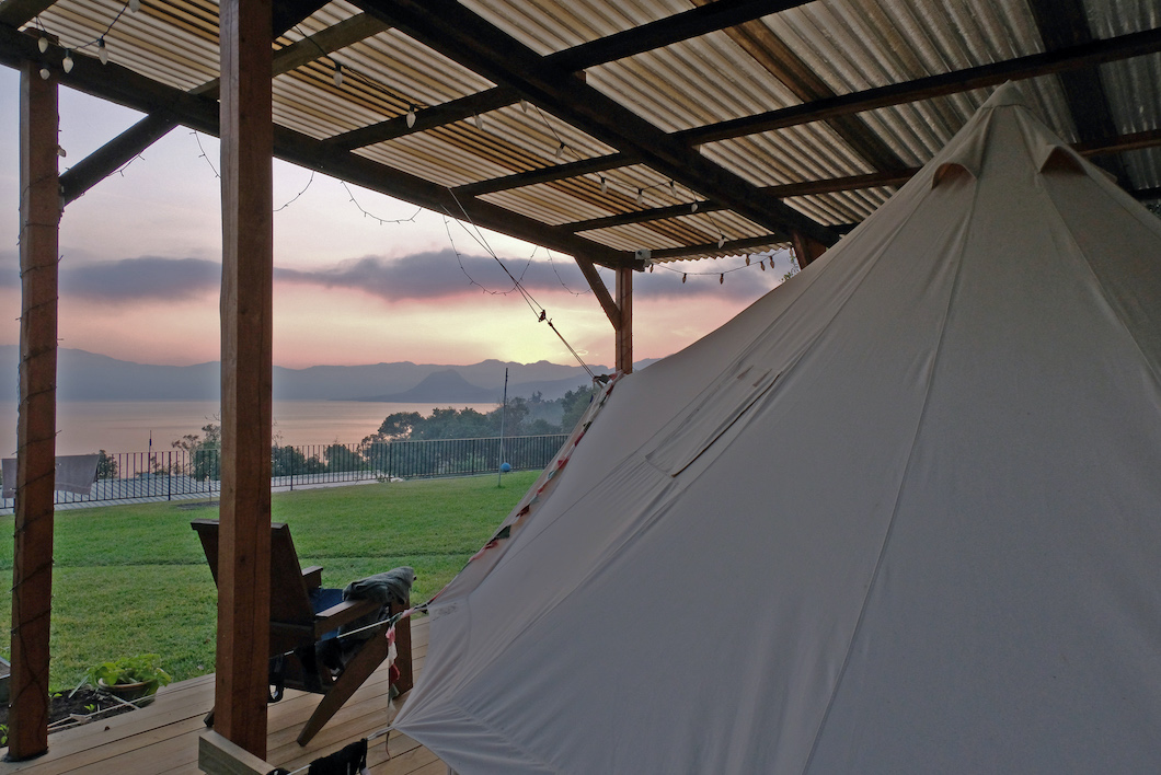Dieser See stand ziemlich von Beginn an als ein festes Ziel auf dem Programm. Auch, dass wir hier vermutlich länger bleiben, denn so liest man es überall – die meisten Backpacker bleiben hier hängen. Die Unterkunftssuche gestaltete sich mal wieder etwas schwieriger und nach über einer Woche Hinterhof mit viel Straßenlärm in Antigua, wollten wir gern etwas Ruhe und was mit Blick. Nach etwas Hin & Her entschieden wir uns für eine außergewöhnliche AirBnB Unterkunft in einem Zelt. Gar nicht so ungewagt bei den Temperaturen hier, aber es stellte sich definitiv als die richtige Wahl heraus, denn wir verlängerten unseren Aufenthalt und hatten wohl einen der besten Ausblicke auf den wundervollen See.