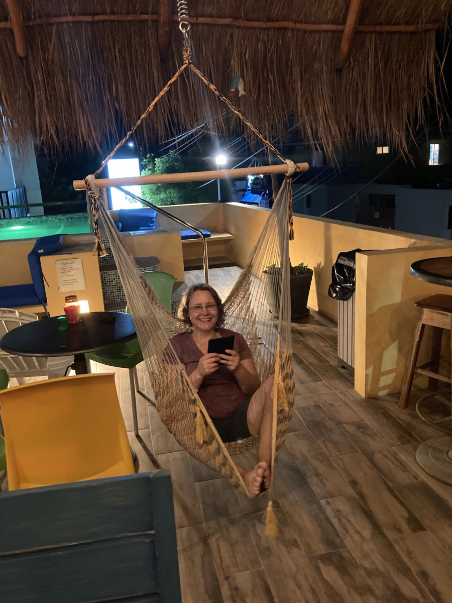 Irgendwo im nirgendwo an einer Tanke wurden wir dann „rausgeschmissen“. Zum Glück verfolgen wir immer auf der Karte mit, wo wir sind, sonst wären wir vermutlich sitzen geblieben. Eine richtige Bushaltestelle gibt es hier also nicht. Die Busse und auch Collectivos (Minivans) halten einfach an “der Brücke” in Downtown von Puerto Morelos und dann kann man zusehen, wie man weiter kommt. Blöderweise begleitete uns der Regen, der uns bereits in Cancun begrüßt hatte, auch hierher. Wir stiegen also mitten im strömenden im Regen aus dem Bus, schnappten das Gepäck und retteten uns erst einmal in einen Miniladen an der Tankstelle. Von dort aus winkten wir aus der Ladentür heraus das nächstbeste Taxi herbei, welches uns dann in Richtung Meer fuhr. Dort bezogen wir ein Zimmer in der Unterkunft Casa Velero Puerto Morelos – mit toller Gemeinschaftsterrasse und Meerblick. Das Zimmer war schön, die Leute vor Ort sehr nett und doch hatten wir das Pech, dass direkt vor der Haustür die Straße aufgerissen wurde und der Lärmuns leider fast die gesamte Zeit – zumindest tagsüber – begleitete. Abends bzw. Nachts gab es zusätzlich (fast) immer laute Musik von der Bar nebenan. So wirklich ruhig, wie wir es uns erhofft hatten, war es also nicht, Bis auf lange Spaziergänge am Strand, durch die Gegend flanieren und in Hängematten zu entspannen, stand nichts auf dem Programm.